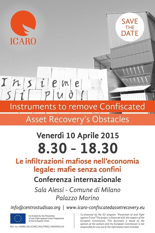 Within the project “ICARO – Instruments to remove Confiscated Asset Recovery’s Obstacles” (Ref. HOME/2013/ISEC/AG/ FINEC/4000005223), of which  C.d.I.E. is partner, on Friday  10 April 2015, at the Municipality of Milan, it was held the international conference "Mafia's infiltrations into the legal economy: mafies without borders".