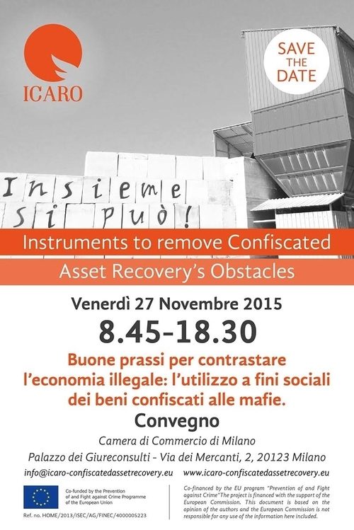 Within the project “ICARO – Instruments to remove Confiscated Asset Recovery’s Obstacles” (Ref. HOME/2013/ISEC/AG/ FINEC/4000005223), of which  C.d.I.E. is partner, on Friday  27 November 2015, at Chamber of Commerce of Milan - Palazzo dei Giureconsulti, it will be held the conference "Best practices to contrast illegal economy: the social use of assets confiscated from mafie".