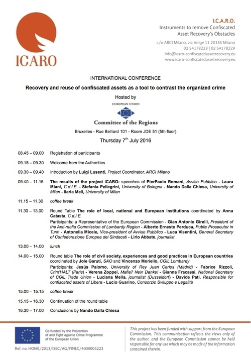On July 7, at the headquarters of the Commmittee of the Regions in Brussels will host the International Conference on Rehabilitation and the social re-use of assets and businesses confiscated as contrast tool against organized crime. The works will describe the results of the ICARO project and will see numerous interventions of experts from various realities.
